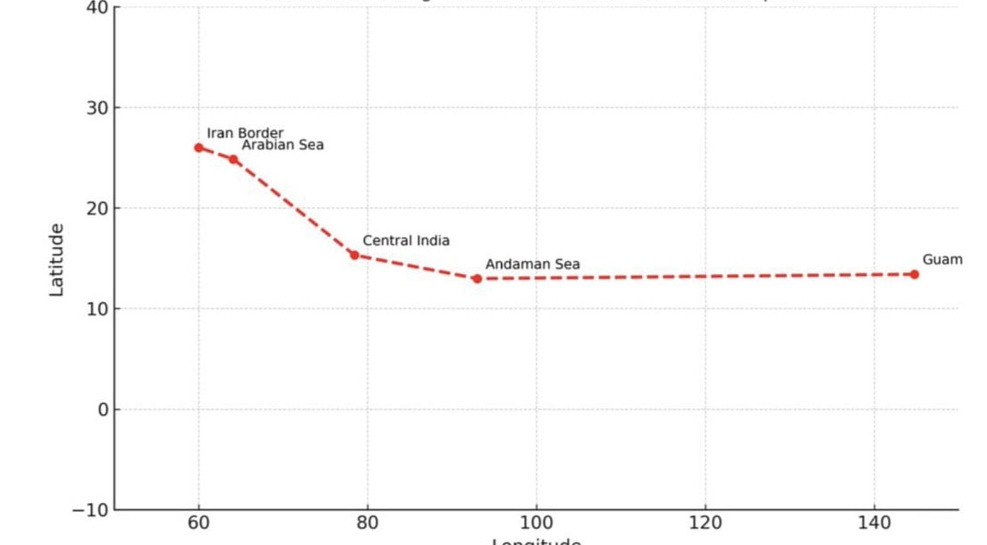 The path used as per the available information is that the B-2 flight originated from Guam (15°N, 145°E), traveled westward across the Pacific to the Andaman Sea (10°N, 95°–100°E), continued over Central India (20°N, 75°–80°E), and concluded near the Iran border along the Arabian Sea (25°–30°N, 60°–65°E).