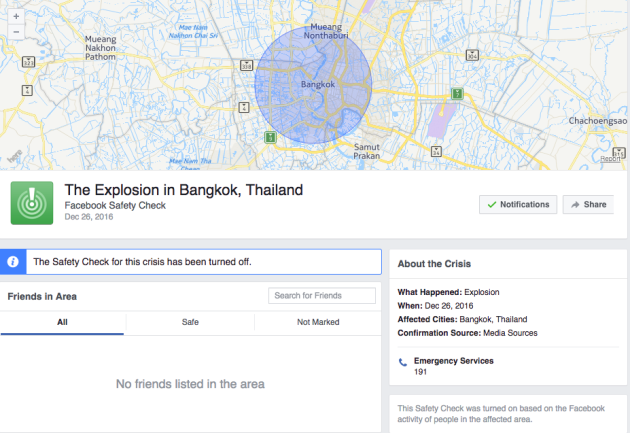 “Safety Check was activated today in Thailand following an explosion. As with all Safety Check activations, Facebook relies on a trusted third party to first confirm the incident and then on the community to use the tool and share with friends and family.”