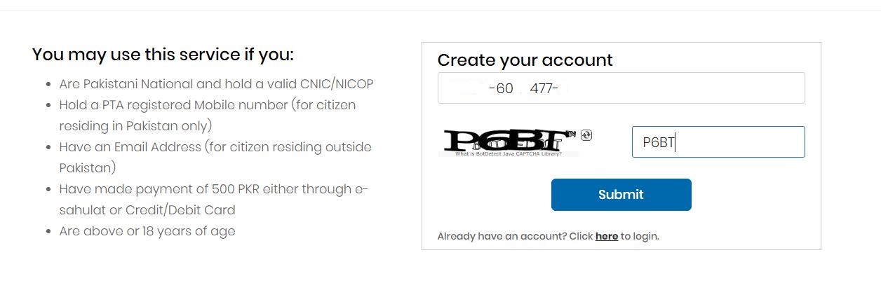 We have personally checked the registration process for a particular CNIC which you can see below step by step. Step 1 involves entering your CNIC and clearing the CAPTCHA code: