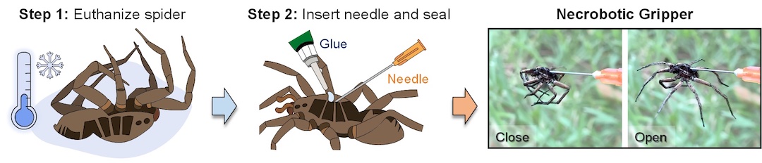 Once a spider dies, its internal valves lose the ability to provide hydraulic pressure therefore causing all of their legs to curl up onto the spider. Now these engineers have found a way to artificially pressurize the spiders leg and make it move any in any way or form they want.