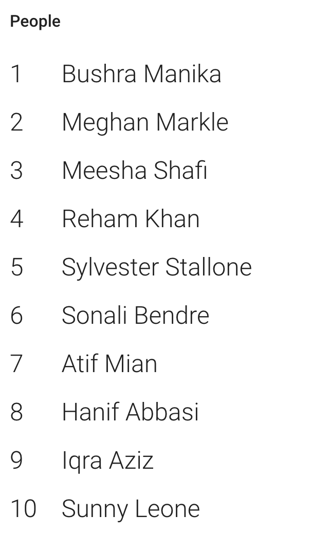 Google has just revealed its country wise search trends and the results for Pakistan are totally worth an eye roll. According to Google, First Lady Bushra Manika remained the most trending person in Pakistan for the year 2018, followed by Meghan Markle, Meesha Shafi, and Reham Khan.