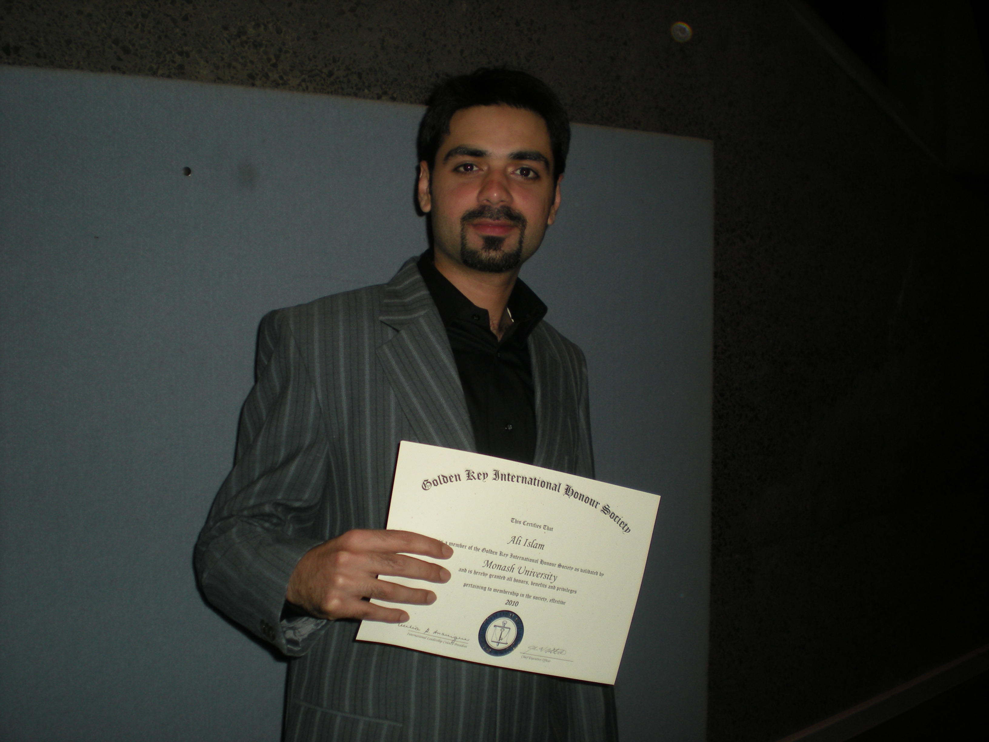 He topped the graduate program and received the Deans Academic Award and the Golden Key International Award.