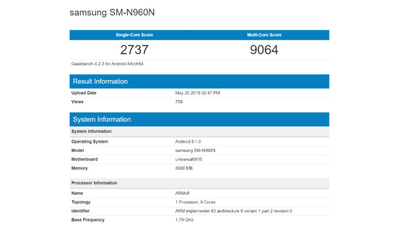As you know that RAM isn’t the only factor behind a fast phone, processors also play a key role to make things work. Rumors suggest that Note 9 will be based on Qualcomm’s latest chipsets Snapdragon 845. But that doesn’t make it any different from Galaxy S9. So, what’s more? A very recent leak of Galaxy Note 9’s benchmarking on Geekbench’s site reveals a device powered by Samsung’s own Exynos 9810 SoC. The listing shows that the device powered by octa-core chipset clocked at 1.79GHz has scored 2737 in single-core and 9064 in multi-core test.