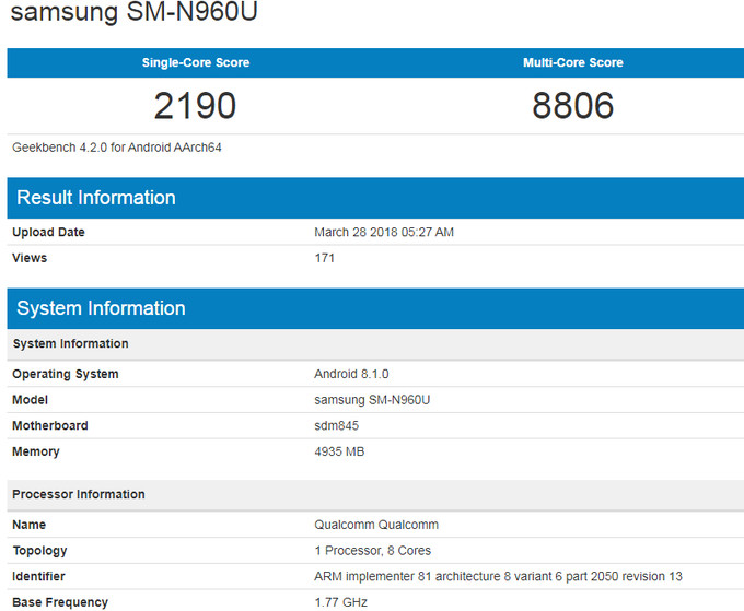 Galaxy Note 9 with model number “Samsung SM-N960U” has surfaced on Geekbench website with Qualcomm’s octa-core Snapdragon 845 chipset paired with 6 GB of RAM.
