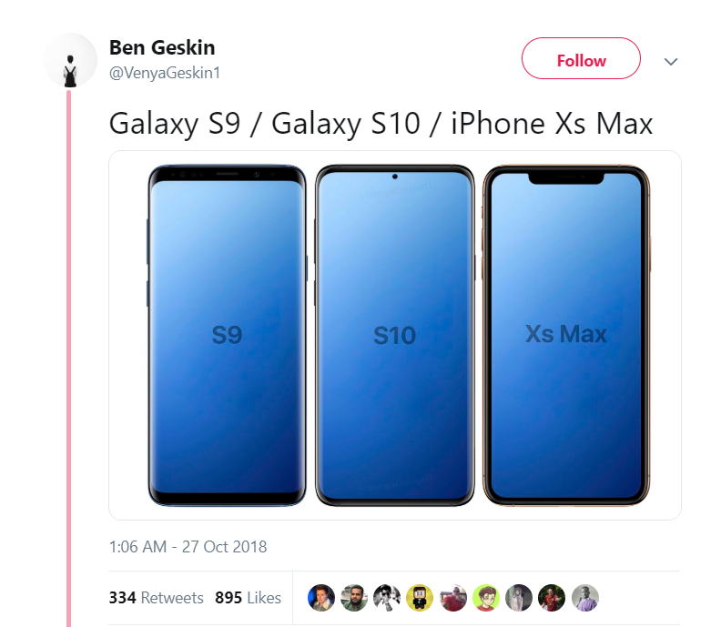 Now, Ben Geskin, a famous concept designer, decided to show just how stunning the Samsung Galaxy S10 all-screen display would be. To do so, the Galaxy S10 design was put between its predecessor, the Galaxy S9, and Apple’s 2018 flagship, the iPhone Xs Max.