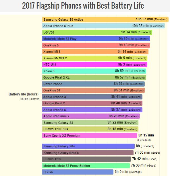 The report indicates that average battery life of smartphones in 2017 is 8 hours and 44 minutes. Samsung Galaxy S8 Active and the Apple iPhone 8 Plus, are the only two flagships with a score of more than 10 hours.