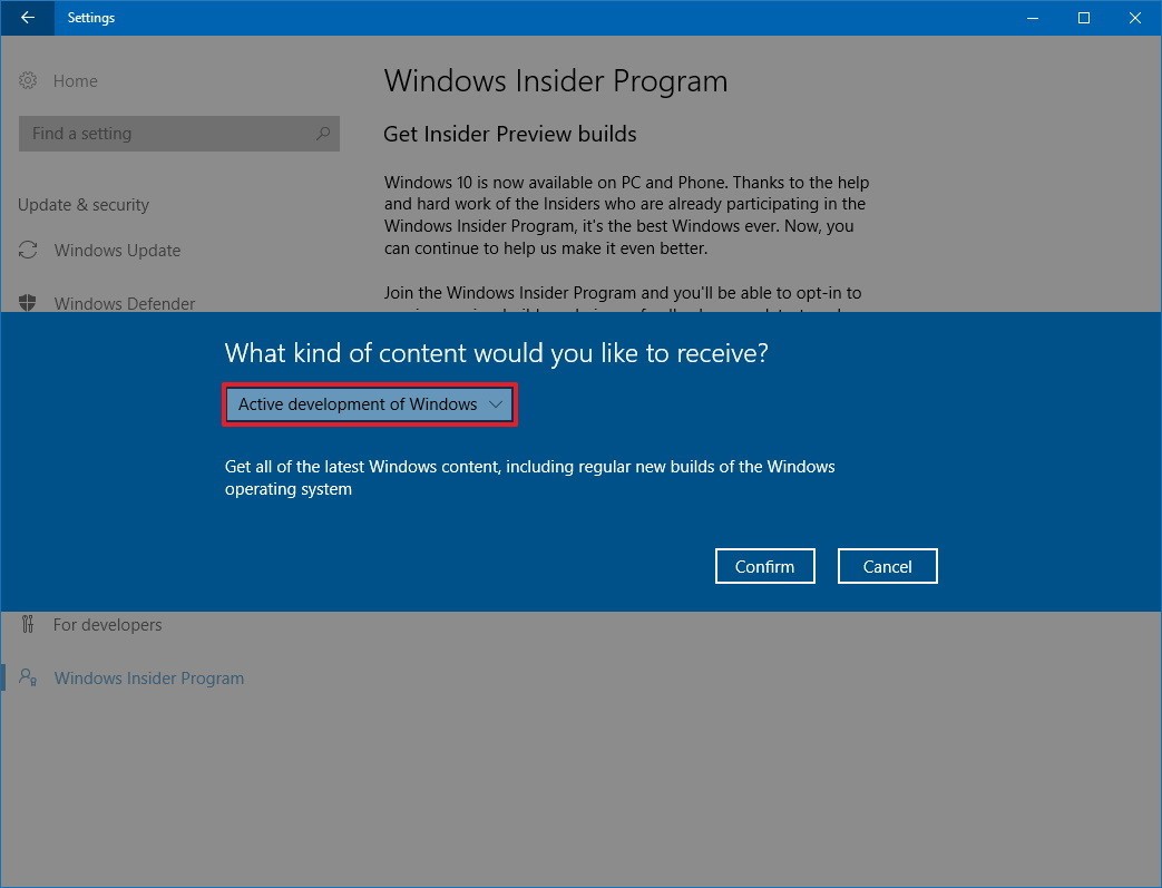 5. On the next page, you’ll see “What kind of content would you like to receive?”, select Active Development for Windows from there.