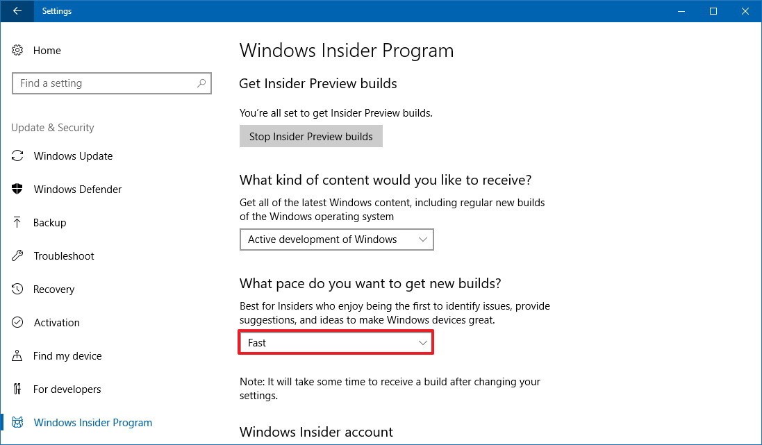 9. Now from “What pace do you want to get new builds?” drop-down, select the “Fast Ring” method.