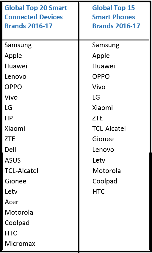 Global Top 20 Smart Connected Devices Brands & Top 15 Smart Phones Brands 2016-17, IDG