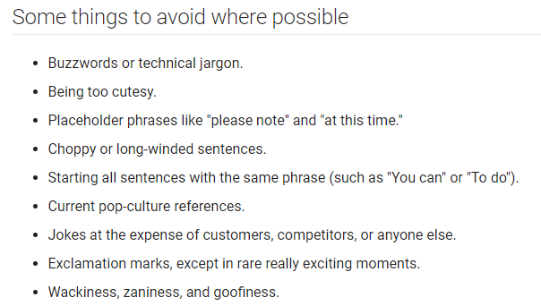 “The style guide is a reference document, so instead of reading through it in linear order, you can use it to look things up as needed. For matters of punctuation, grammar, and formatting, you can do a search-in-page to find items like “Commas,” “Lists,” and “Link text” in the left nav. For specific terms and phrases, you can look at the word list.”