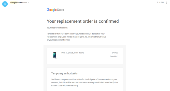 If you apply for the replacement, Google will charge you the full price from your credit card as a security ($770 for the 32GB Pixel XL and $840 for the 128GB version) and will ship your phone instantly. You’ll then have to ship your Nexus 6P back to Google within 21 days and you’ll get your full money back. If you fail to ship your phone within 21 days, you will not get your money back and the phone will still be yours.