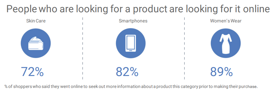 People prefer learning about the product from online sources before going to purchase, according to the survey, 72% people search online about the skincare products, 82% search for mobile phones and 89% participants turns to the internet to seek more information about the product of this category before making the decision over the purchase.