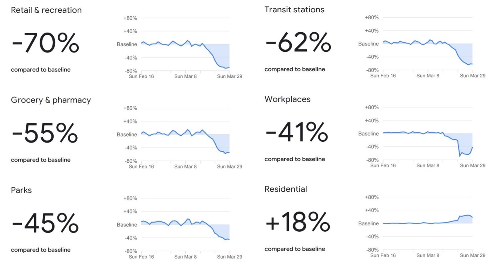 The Google COVID-19 Community Mobility Reports come in and effort to help health workers and law enforcement agencies better understand their communities’ movements. “Each Community Mobility Report is broken down by location and displays the change in visits to places like grocery stores and parks,” Google says in their post. Each report shows six graphs and a corresponding percentage in the negative or positive direction.