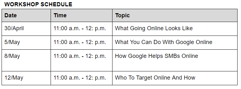 Pick the time slot that works best for you from the following dates. Sign up here for the free workshop that focuses on handy digital tools as well as tips and tricks for small businesses that are looking for ways to connect and stay in touch with both customers and employees. Each hour-long session will be conducted live by Google trainers. These sessions will not be recorded, so don’t miss out.