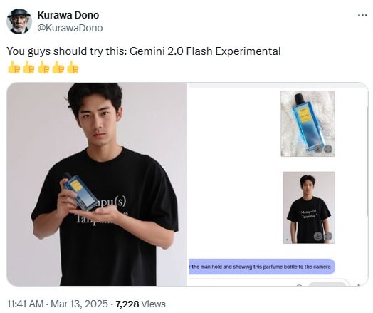 Another user showcased how Gemini 2.0 Flash seamlessly combined two separate images—one of a man and another of a perfume bottle—into a single, realistic composition: “You guys should try this: Gemini 2.0 Flash Experimental”