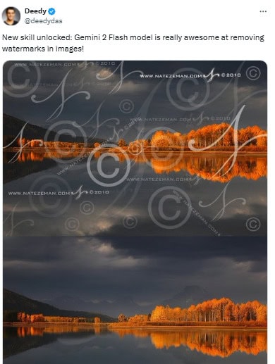 However, the model has also sparked controversy. Some users discovered that Gemini 2.0 Flash can remove watermarks from stock images, raising concerns about intellectual property violations. User demonstrated this issue: “New skill unlocked: Gemini 2 Flash model is really awesome at removing watermarks in images!”