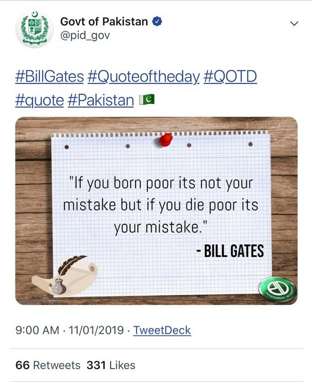 “If you born poor its not your mistake but if you die poor its your mistake.” This was the quote that was posted by the government’s official twitter. Clearly. the tweet is grammatically incorrect. In addition to that, it was attributed to Bill Gates, the principal founder of Microsoft. However, it is not clear whether or not Gates has actually said any such thing.