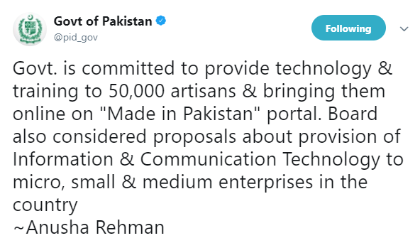 At the start of this month, while chairing the 57th meeting of the Board of Directors of USF company, it was stated by the Minister of State of IT&T (Information Technology and Telecommunication), Anusha Rehman that Pakistani government is committed to providing technology and training to 50,000 artisans and bringing them online on ‘Made in Pakistan’ portal through the Universal Service Fund company.