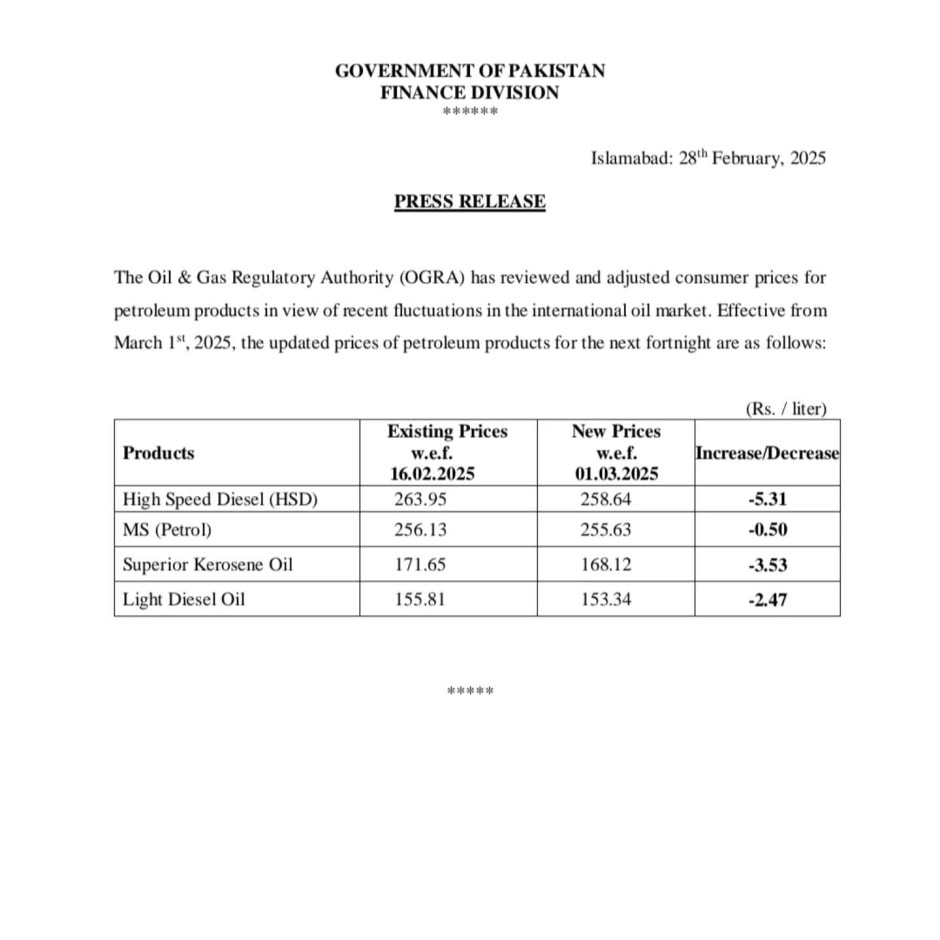 Govt Reduces Petroleum Prices in Pakistan Effective March 1, 2025