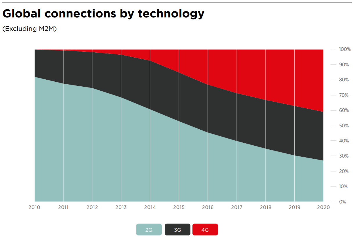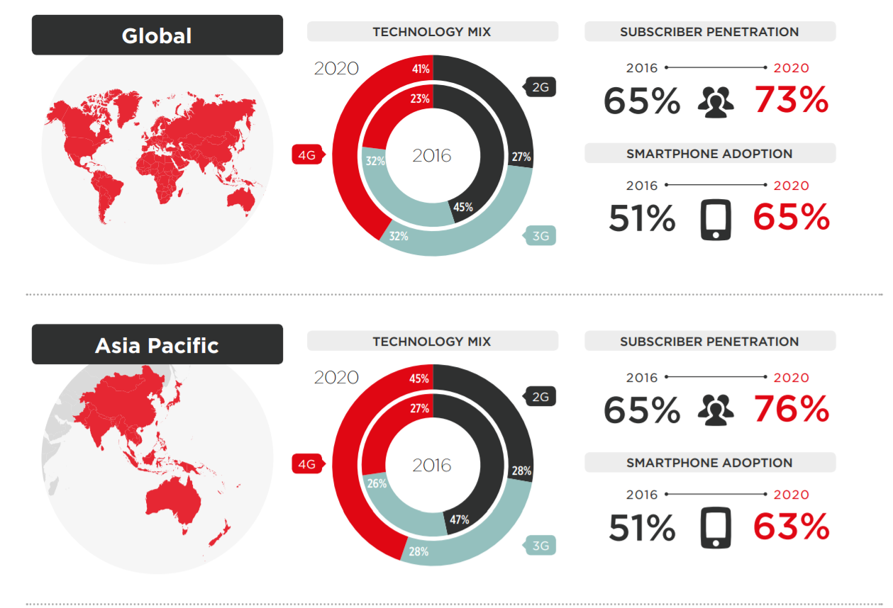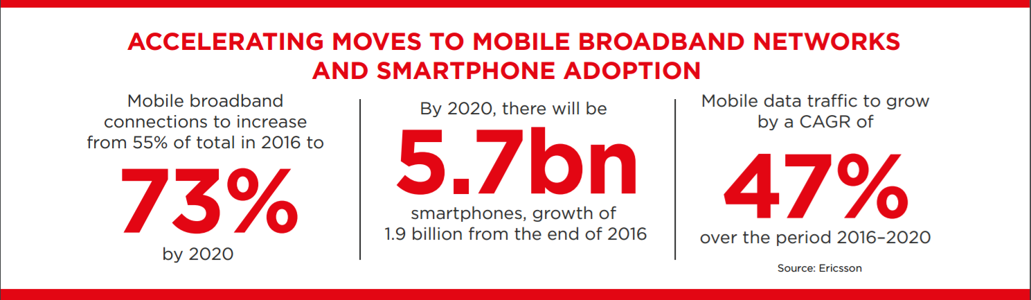 - Mobile broadband connections (3G and 4G technologies) accounted for 55% of total connections in 2016 – a figure that will be close to three-quarters of the connections base by 2020.