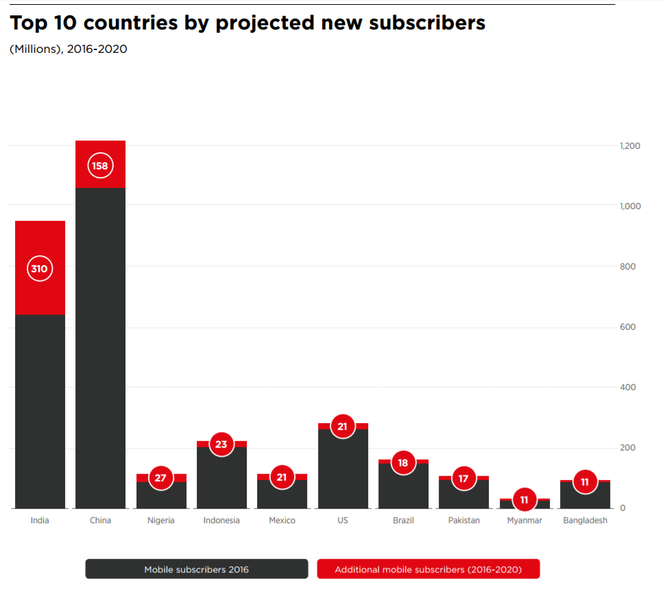 Ten countries will account for 72% of growth in new mobile subscribers worldwide. India, already the world’s second largest mobile market will be the primary driver of this growth, with 310 million new unique subscribers expected in the period to 2020, helped by improving affordability, falling device prices and better network coverage. This is followed by China and fast-growth Asian markets including Indonesia, Pakistan and Bangladesh.