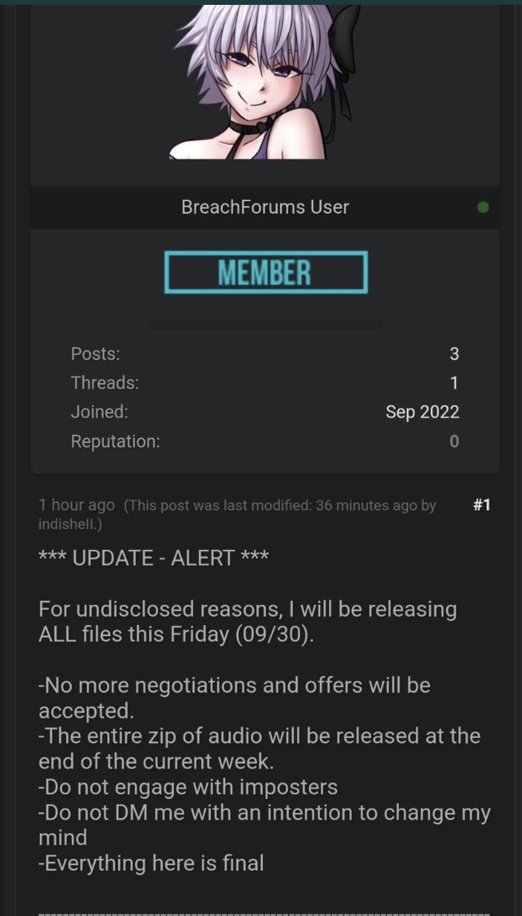 The seller just today made a new post on the dark web forum saying that no further bids will be accepted and that all the audio files will be released on 30th September.