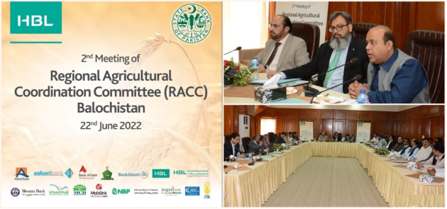 HBL as a designated champion bank for Balochistan hosted the 2nd meeting of the Regional Agricultural Coordination Committee (RACC) in collaboration with the State Bank of Pakistan (SBP). The meeting was held in Quetta on 22 June 2022. Kashif Umar Thanvi, Head Rural Banking – HBL & Co-Chairman RACC, led the meeting and was attended by Noor Ahmed-Director, Agriculture, Credit & Microfinance Department – SBP, Rass Masood, Chief Manager – SBP BSC – Quetta (Acting) and Ikram Ullah Qadri, Senior Joint Director AC&MFD-SBP. Other senior executives from SBP, HBL, all active banks operating in Balochistan, Government officials and farming community also attended the session.
