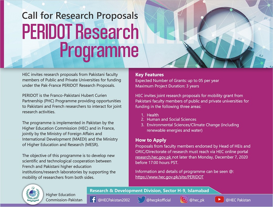 The Higher Education Commission (HEC) of Pakistan has now opened their PERIDOT Research funding program for full-time faculty members of both the public and private sectors.