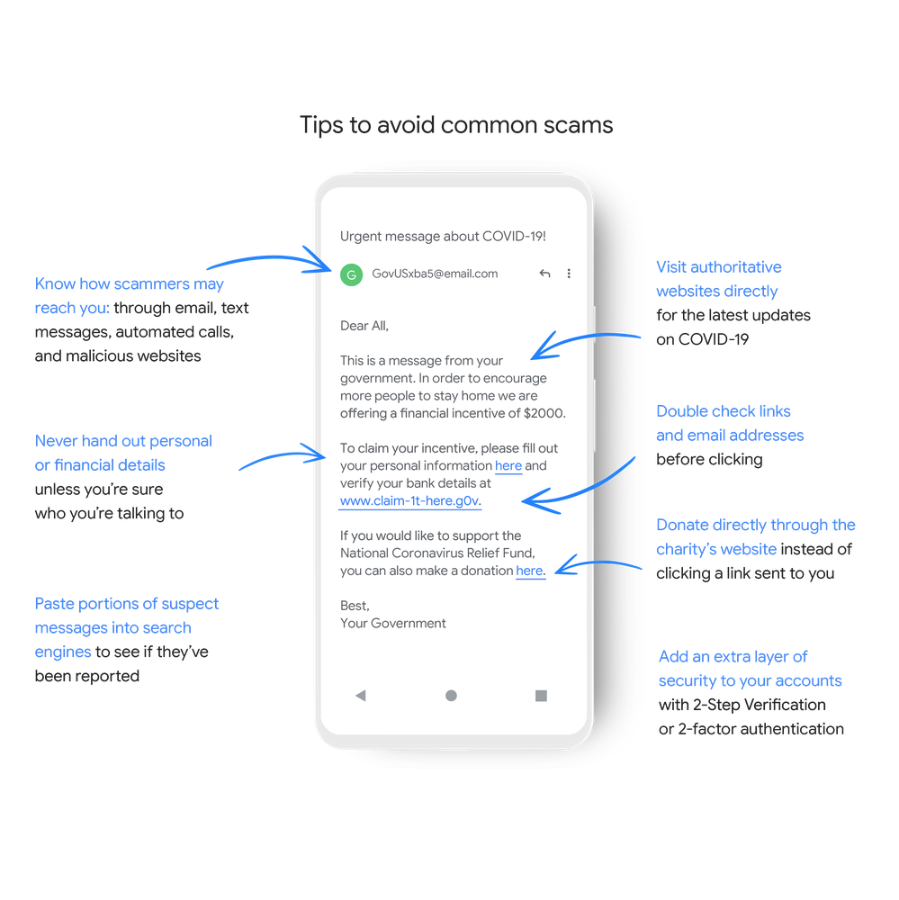 With many of the COVID-19 related scams coming in the form of phishing emails, it’s important to pause and evaluate any COVID-19 email before clicking any links or taking other action. Be wary of requests for personal information such as your home address or bank details. Fake links often imitate established websites by adding extra words or letters to them—check the URL’s validity by hovering over it (on desktop) or with a long press (on mobile). Keep these downloadable tips handy and learn more at g.co/covidsecuritytips (also available in Urdu).