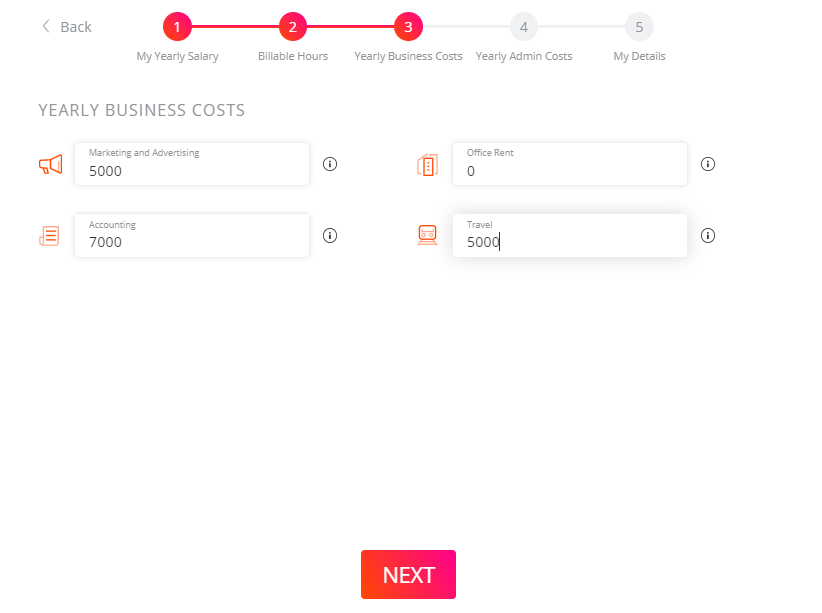 Step 3 and 4: Come up with an estimate of the total costs you incur, including marketing, traveling, rent, internet, and other miscellaneous costs. (Note: if one of the costs you incur isn’t listed here, add it to any other cost available and enter the amount).