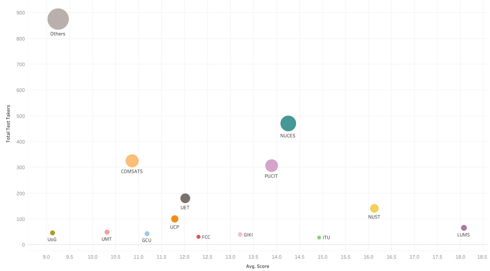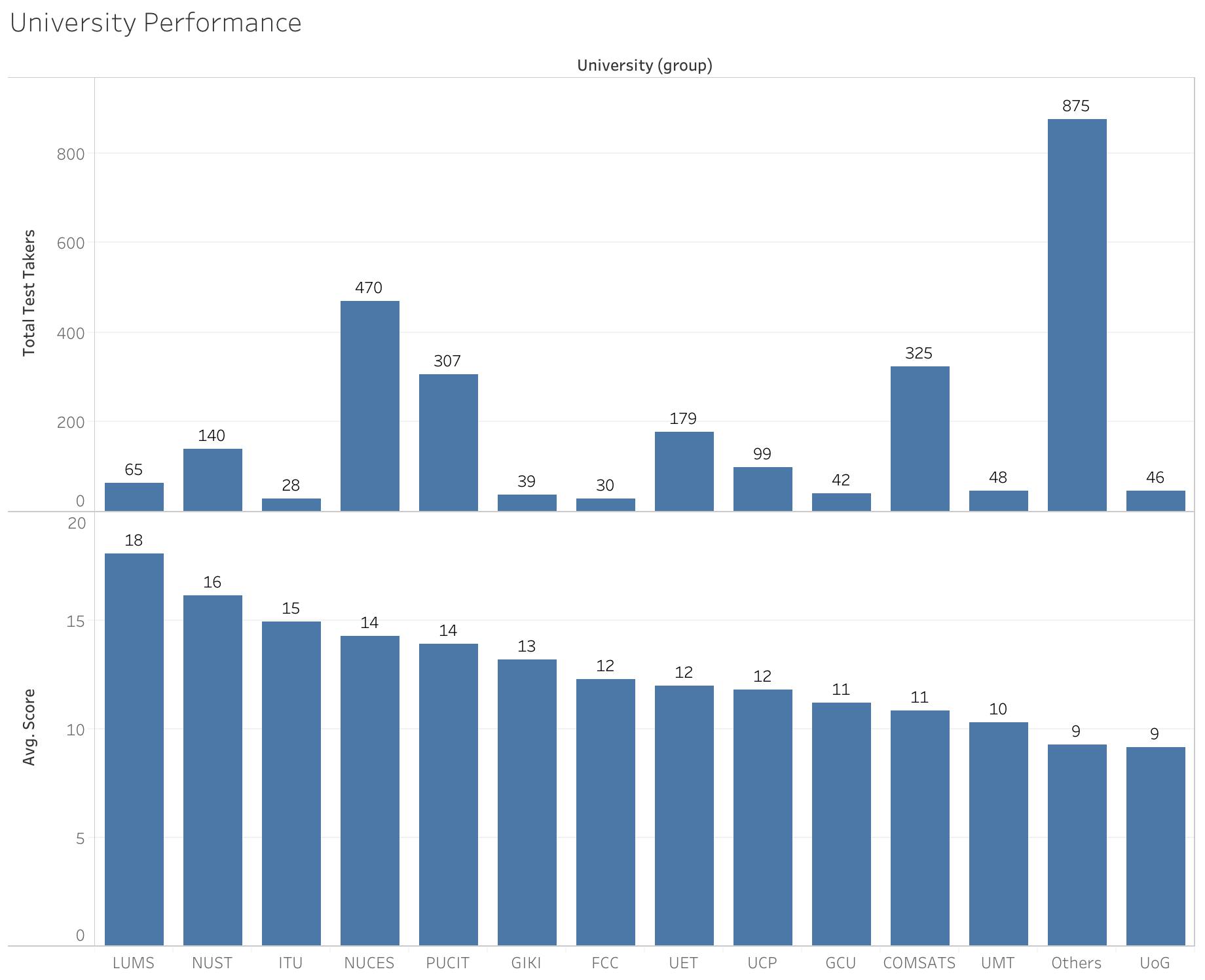 More than 50 universities’ students were part of the initial exam. Total students from each university alongside the average scores taken by students in that varsity are shared in the graph above. NUCES and COMSATS individually had more students than majority other universities whereas LUMS had the highest average score of 18 in the test. That is not to say that they are the brightest because only sixty-five students gave the test but gives a good overview of how each university stacks up against the other in the exam.