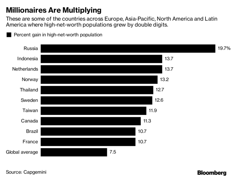 As identified by Bloomberg, these countries have had the highest increase in ranks of millionaires.