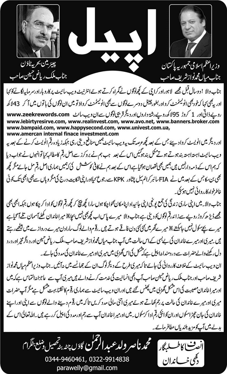 The websites shut down after a few months and ran away with the money they had collected from Nasir and maybe, many other innocent individuals. Nasir has not only lost his own money but also led his family and friends into a financial loss. As a last resort, Muhammad Nasir has appealed Nawaz Sharif and Malik Riaz Hussain, chairman of Bahria Town, to help him get out this mess.