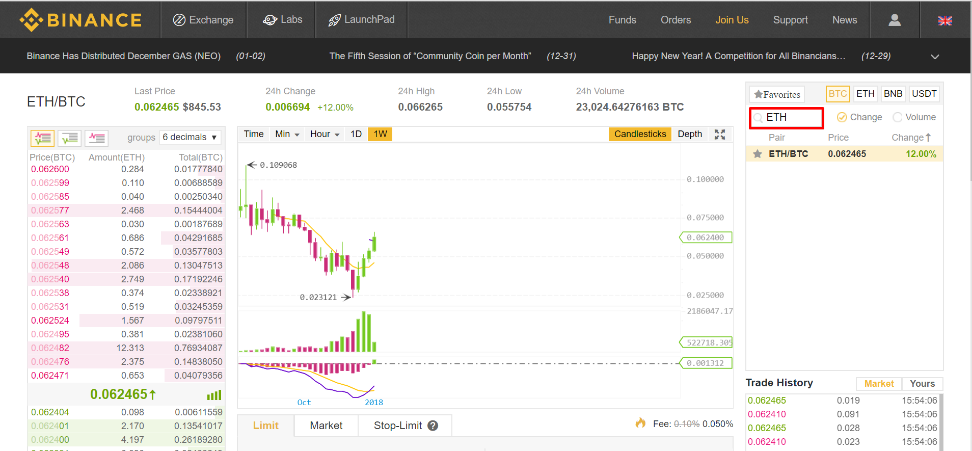 In the right side of exchange dashboard, there will be some popular trading pairs. Search for the Ethereum (ETH) there. Once you find it, click on it.