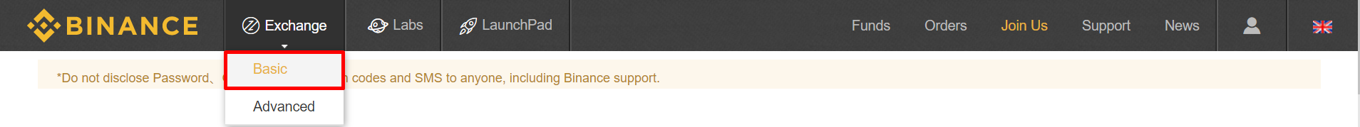 Once you have sent the Bitcoins to Binance, you are now ready to trade them for buying Ethereum. Through the menu, go to Exchange > Basic