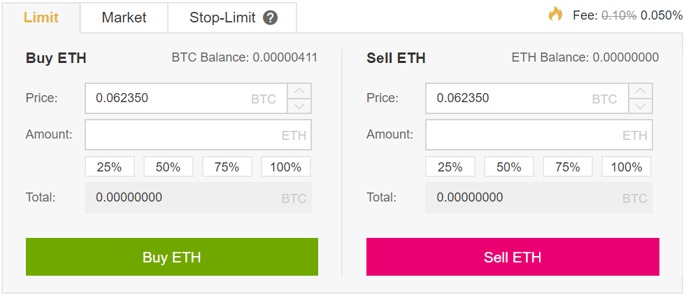 Now you are ready to trade your Bitcoins for Ethereum. Focus on the below portion of the trading user interface. Through this part, you can place an order to exchange your Bitcoins for Ethereum. In the below section, you can either mention for what amount you want to buy Ethereum or you can pick one of the percentages to decide how much percentage of your money, you want to use for buying Ethereum.