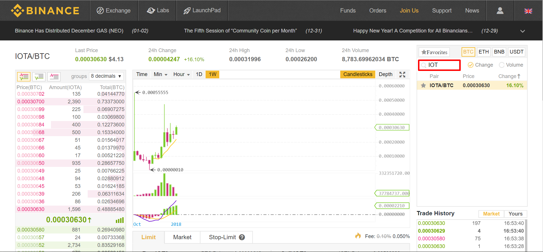 In the right side of exchange dashboard, there will be some popular trading pairs. Search for the IOTA (IOT) there. Once you find it, click on it.