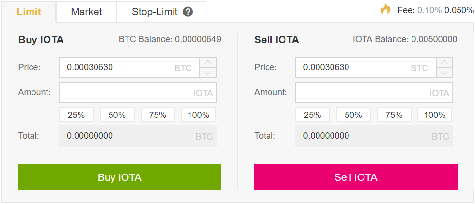 Now you are ready to trade your Bitcoins for IOTA. Focus on the below portion of the trading user interface. Through this part, you can place an order to exchange your Bitcoins for IOTA. In the below section, you can either mention for what amount you want to buy IOTA or you can pick one of the percentages to decide how much percentage of your money, you want to use for buying IOTA.