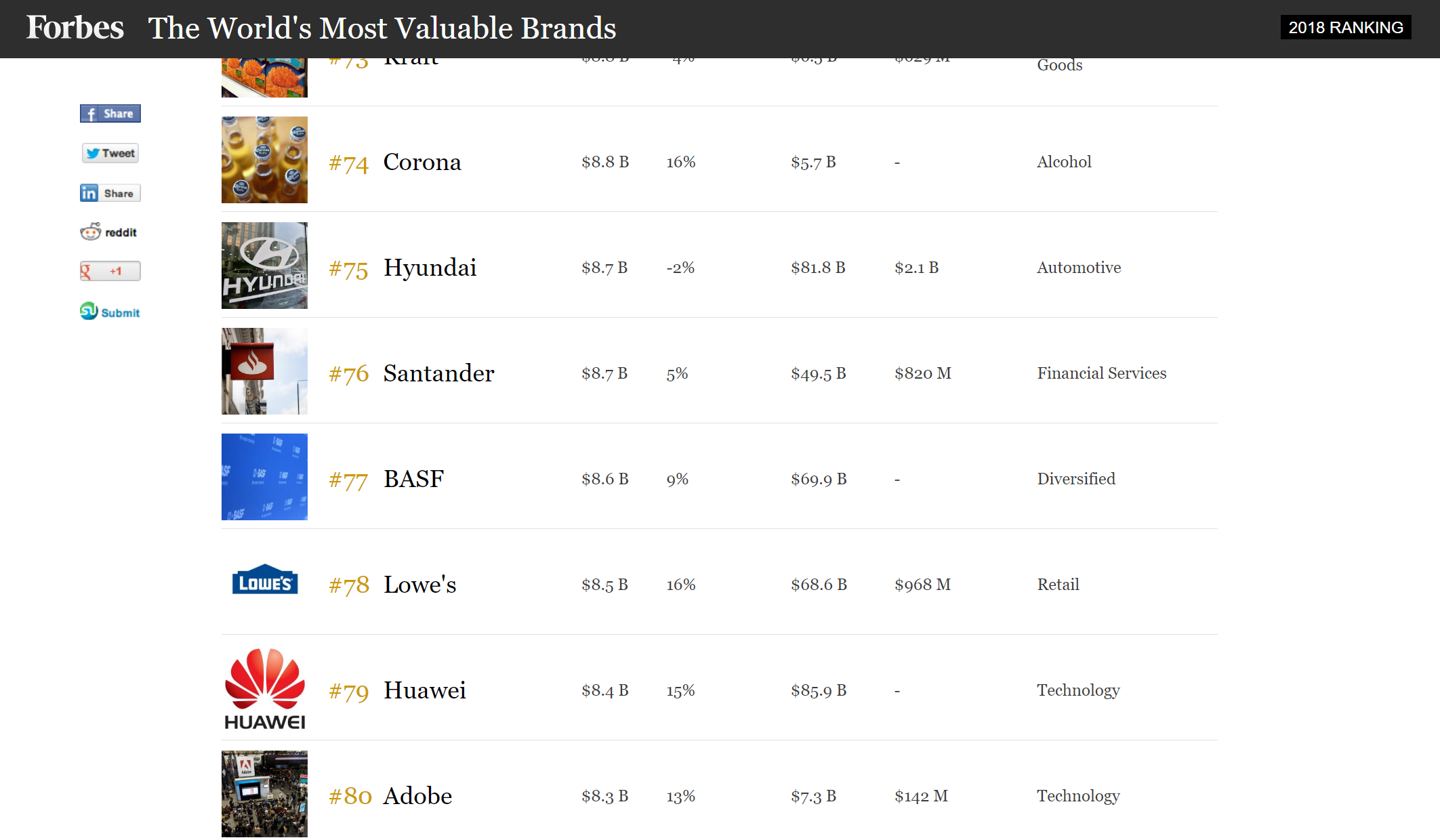 The Chinese tech giant entered the list for the first time in 2017 and after a year of rapid development, Huawei’s brand value increased by 15% year-on-year to USD 8.4 billion making it go from 88th to 79th in Forbes ranking list.