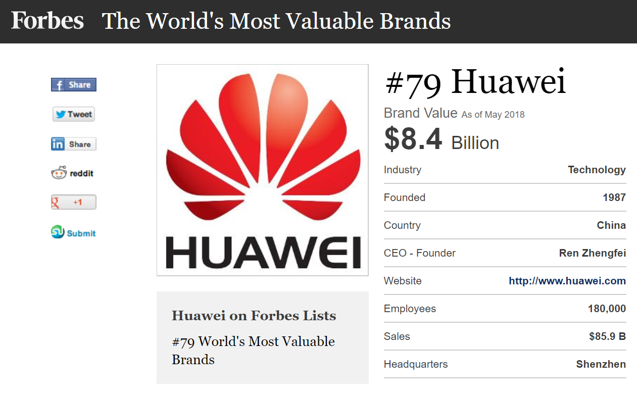 Huawei is the only Chinese company to feature in Forbes’ World’s Most Valuable Brands 2018