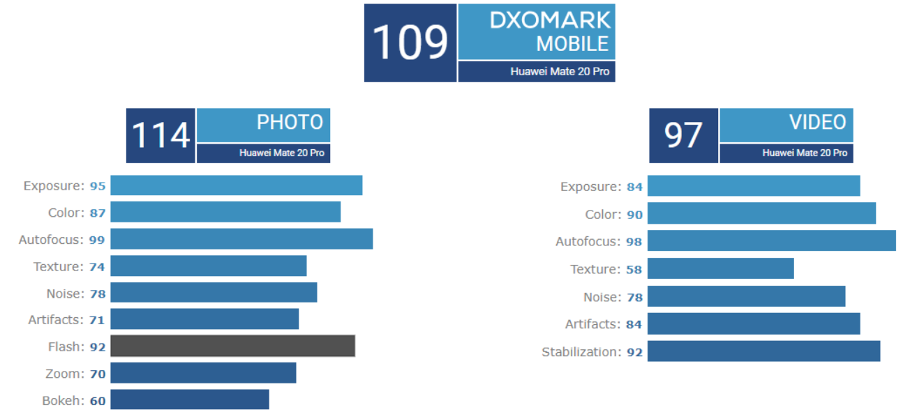 The Huawei Mate 20 Pro achieves a very good Video score of 97 points, just one point below the P20 Pro. Its only real weak points are the stabilization that generates a noticeable drift, and noise in low light. We calculate the overall video score using the following video sub-scores: Exposure (84), Color (90), Autofocus (98), Texture (58), Noise (78), Artifacts (84), and Stabilization (92).