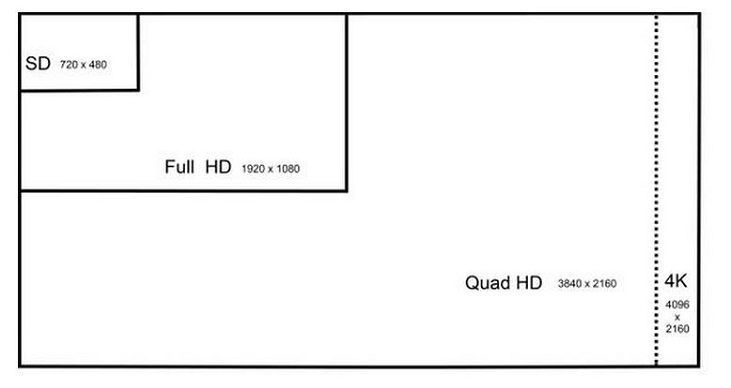 The image below compares the four resolutions: standard definition; full high definition, Quad HD and 4K.