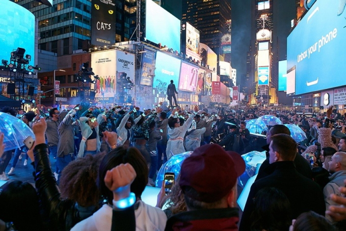 The Times New Square seen shining with sparkling blue colors as Samsung tries to captivate the audience.