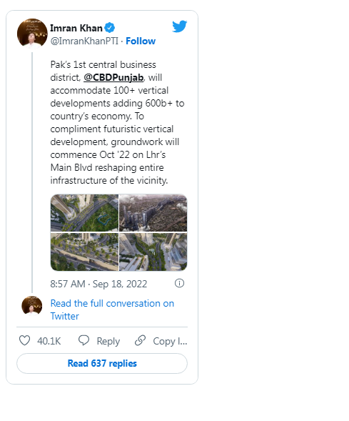 Former prime minister Imran Khan shared details of the project in a recent social media post which includes the Future Sceneries of the Central Business District Punjab, Lahore. The PTI chief said the groundwork for over 100 skyscrapers in the first Central Business District Punjab to accommodate businesses at a central location in Lahore will be launched on October 22 and the development will also start on the same date.