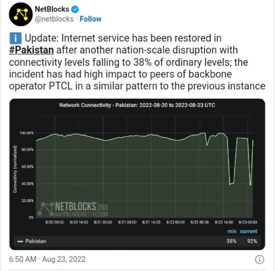 “Technical fault/cut in PTCL optic fiber network due to unprecedented floods, which impacted internet services at midnight at some locations, was repaired & restored within one hour,”