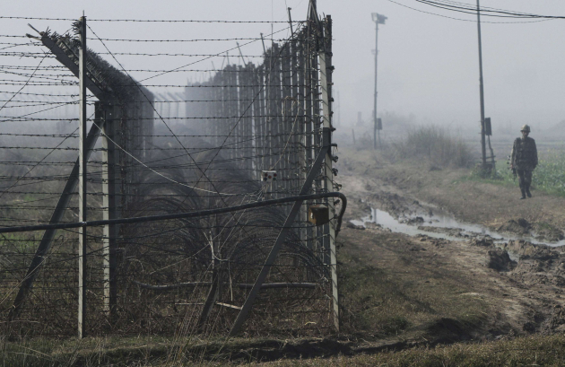 An Indian Border Security Force (BSF) soldier patrols near the fenced border with Pakistan amid fog in Suchetgarh, southwest of Jammu January 10, 2013. Indian troops killed a Pakistani soldier on Thursday in the disputed region of Kashmir, the Pakistani army said, in the worst outbreak of violence in the area since the nuclear-armed neighbours agreed a ceasefire nearly a decade ago. REUTERS/Mukesh Gupta (INDIAN-ADMINISTERED KASHMIR - Tags: MILITARY POLITICS)