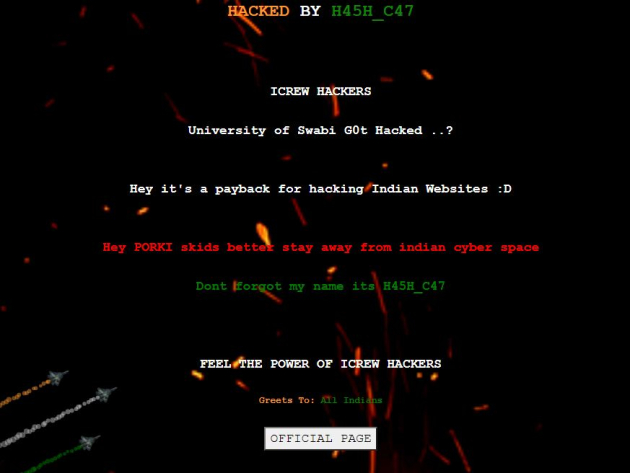 Indian hackers going by the name of “ICREW Hackers”, led by “H45H_C47”, have hacked the website of the University of Swabi. According to the current version of the website, the hackers have done this as revenge from Pakistani hackers for taking down multiple Indian sites.