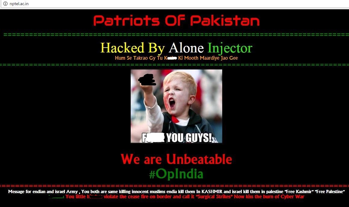 Alone Injector first hacked Indian website of National Program on Technology Enhanced Learning (NPTEL) in October 2016 after “Surgical Strikes” incident.