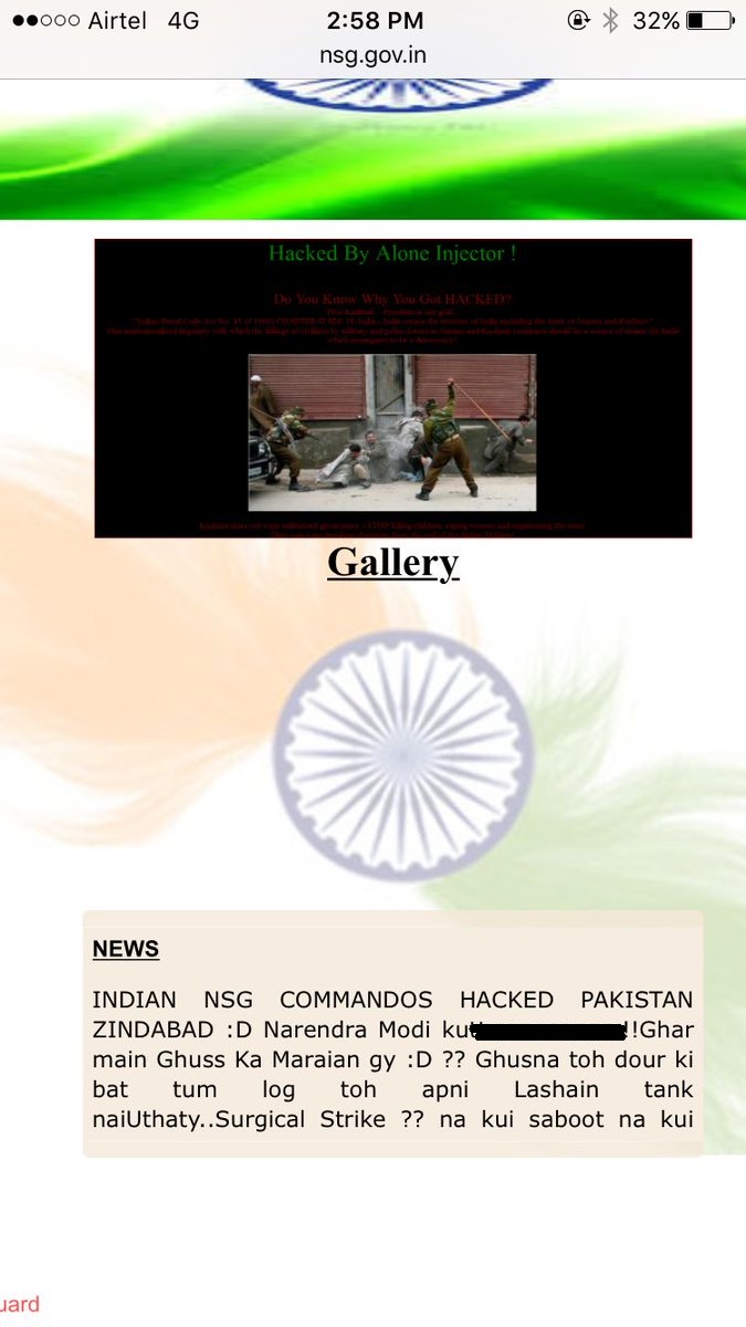 A group of Pakistani hackers who identified themselves as “Alone Injector”, have allegedly hacked India’s anti-terrorism website, nsg.gov.in, which is currently unavailable and showing the message “This site can’t be reached”.