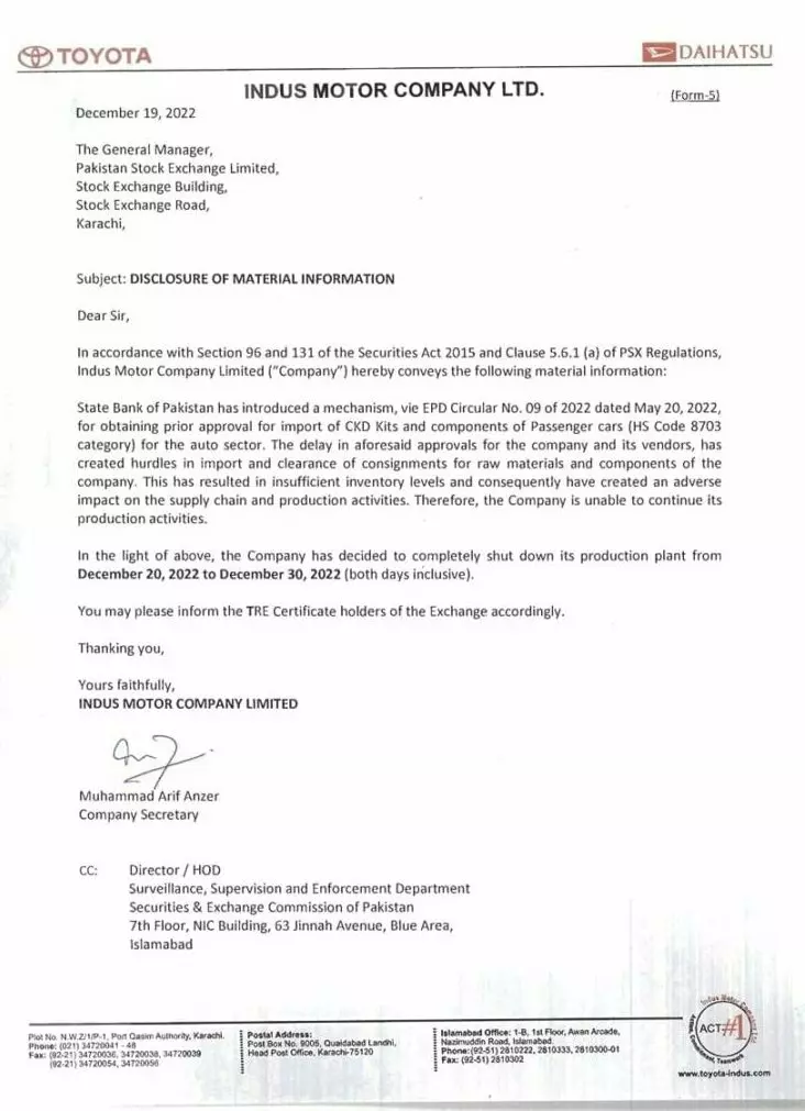 Indus Motors Company (IMC) the maker of Toyota cars in Pakistan has announced that they are to shut down its production plant in the country from December 20-30, citing a delay in import approvals from the State Bank of Pakistan (SBP). Indus Motors sent a letter addressed to the general manager of the Pakistan Stock Exchange, the IMC management said that the central bank had introduced a new mechanism for obtaining prior approval for the import of “CKD kits and components of passenger cars (HS Code 8703 Category)” for the auto sector.